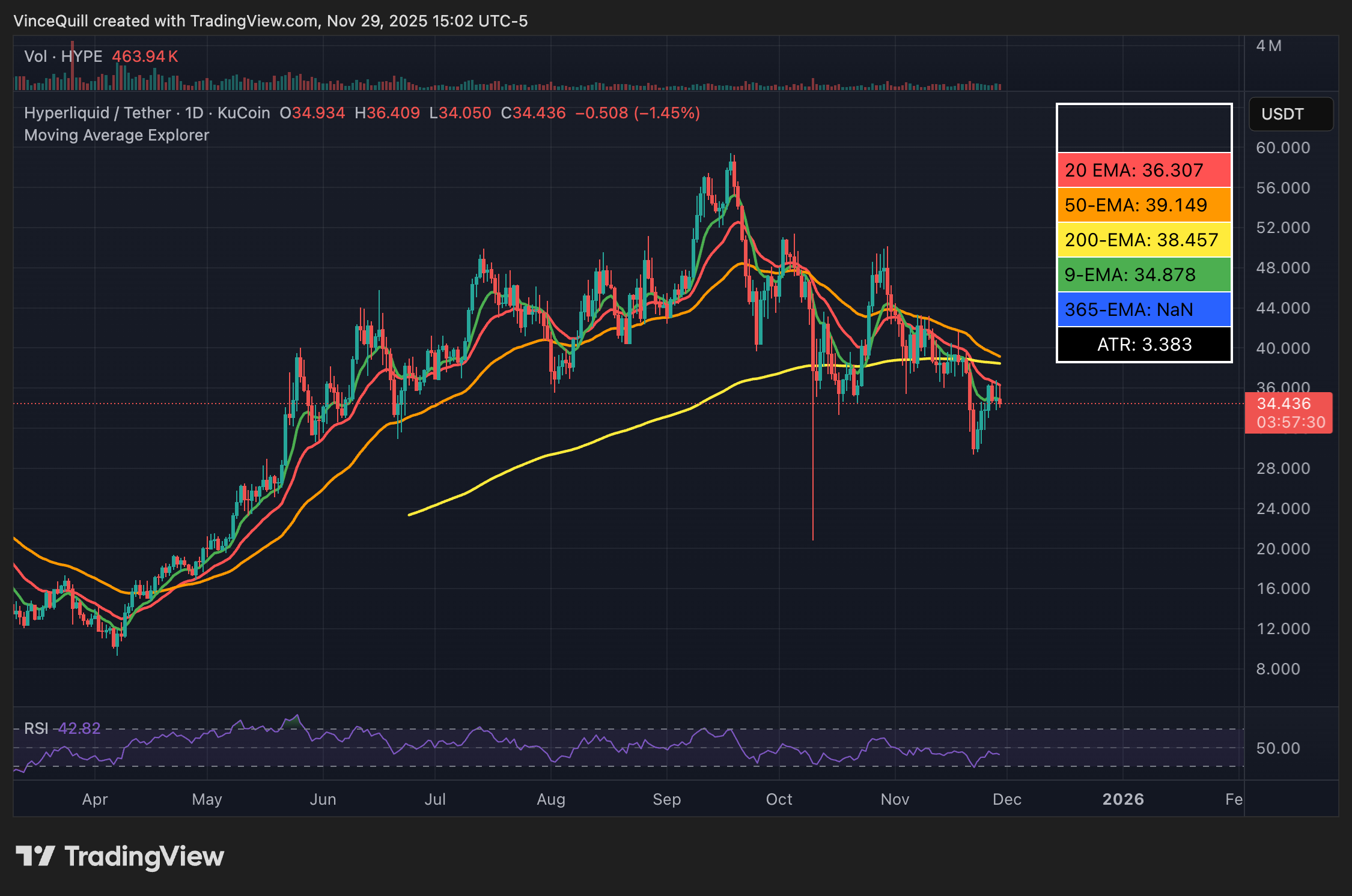 Цена HYPE упала примерно на 42% от своего исторического максимума в $59,40, зафиксированного в сентябре. Сейчас токен торгуется значительно ниже 200‑дневной скользящей средней — ключевого уровня поддержки.