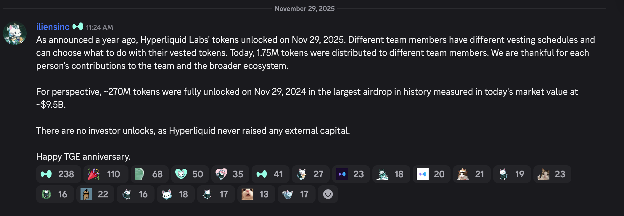 Разблокировка токенов была анонсирована заранее и соответствует графику распределения HYPE. Об этом сообщил разработчик Hyperliquid под псевдонимом iliensinc, отметив первую годовщину исторического аирдропа и выпуска токенов Hyperliquid.