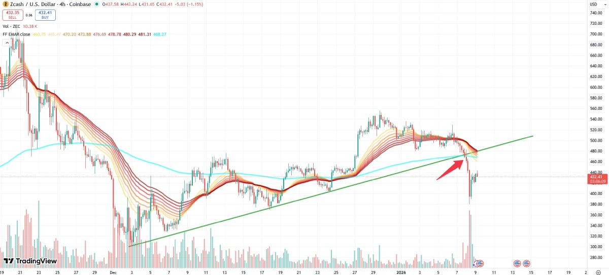 Тем не менее владельцам ZEC, купившим монеты за $480 или ещё дороже, явно не до смеха, потому что на рынке монеты с высокой долей вероятности продолжится нисходящее движение. Ведущий аналитик Happy Coin News Юрий Савельев прогнозирует сохранение медвежьего тренда по двум причинам. Во-первых, цена Zcash пробила линию восходящей тенденции, возникшей в начале декабря, а во-вторых, она закрепилась ниже линии скользящей средней за 800 часов.