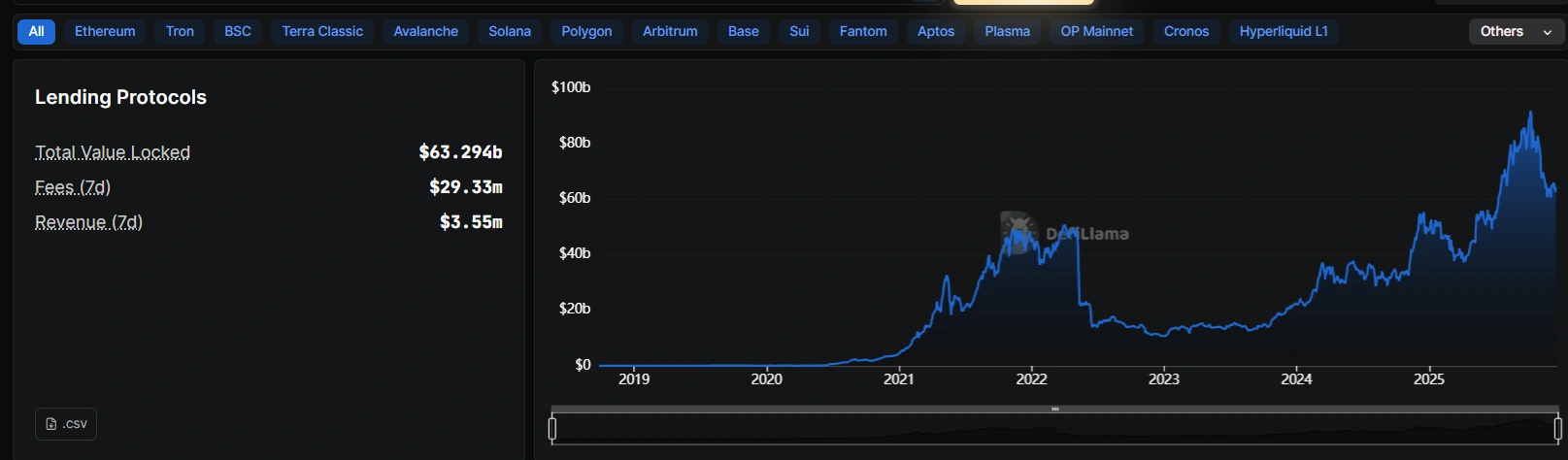 DeFi lending protocols lock a combined $63.3 billion value after peaking earlier in the year. Source: Defillama