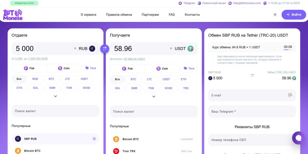 Сервис ориентирован на клиента и предлагает оперативную поддержку, готовую ответить на вопросы и помочь в решении любых задач, связанных с обменом.