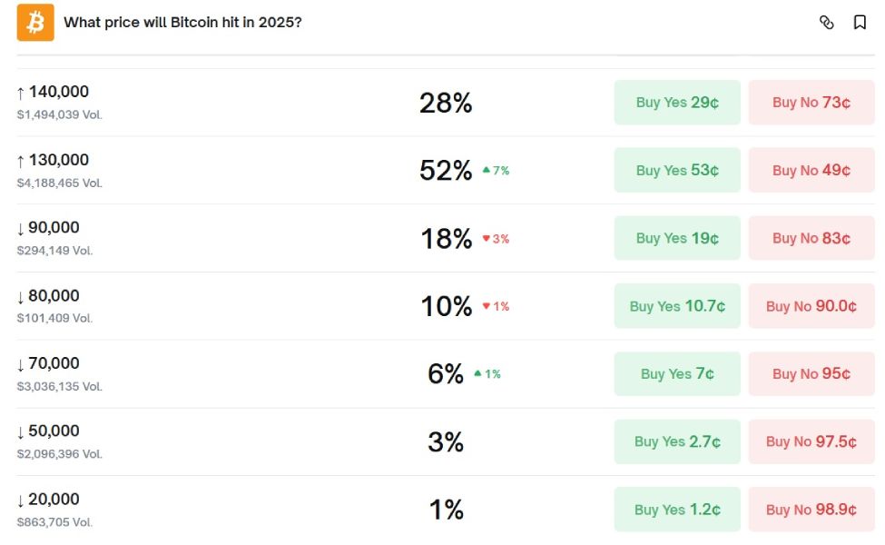 Однако большинство азартных членов криптосообщества, которые делают ставки на платформе Polymarket, придерживаются иной точки зрения и прогнозируют продолжение восходящей тенденции на рынке биткоина. Вероятность того, что в 2025 году цена монеты вырастет до $130,000, оценивается в 52%, а шанс падения стоимости актива до $70,000 составляет лишь 6%.