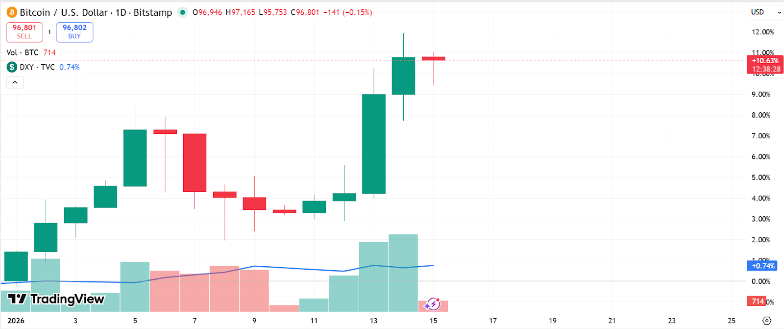 По данным TradingView, с начала года цена биткоина выросла на 10,6 %, в то время как индекс доллара США (DXY) за тот же период вырос на 0,75 %.