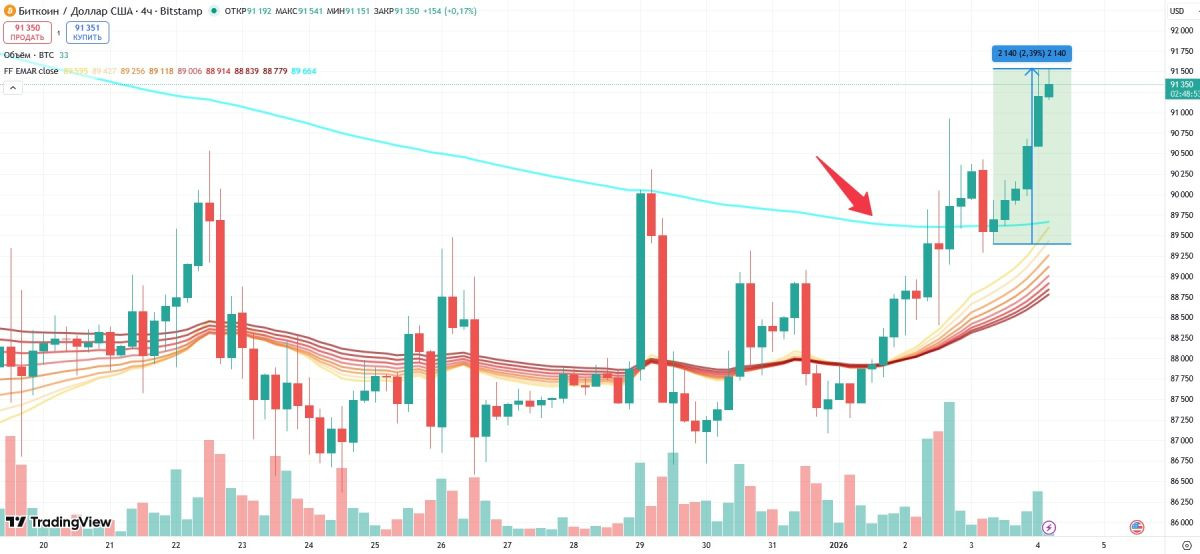 Отдельно стоит отметить, что 4 января курс BTC вплотную приблизился к 23,6% уровня Фибоначчи с учётом падения цены монеты со $126,091 до $80,584. Соответственно, если быкам удастся взять штурмом этот барьер, расположенный на отметке $91,316, и закрепиться над ним, то у биткоина появится шанс подорожать до $98,000. В противном случае криптовалюта снова начнёт дешеветь.