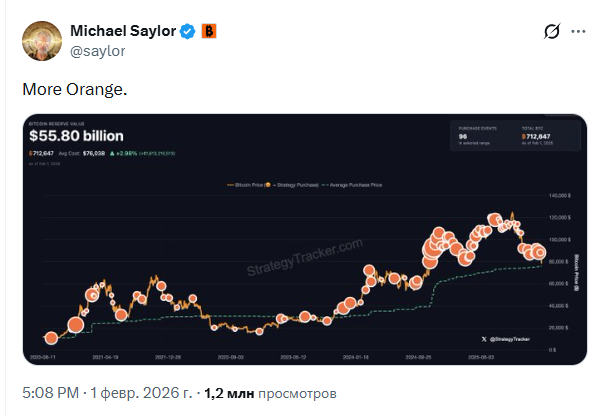 В воскресенье 1 февраля Майкл Сэйлор опубликовал сообщение со знакомыми для сообщества криптовалют словами «ещё больше оранжевого». Тем самым он вселил надежду на то, что компания продолжит накапливать биткоины, даже при условии того, что цена BTC опустилась ниже ключевых уровней поддержки.