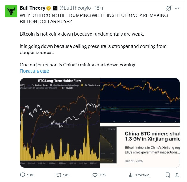 Интересно, что аналитики Bull Theory связали нынешние просадки биткоина с продажами, вызванными более сложными мотивами: