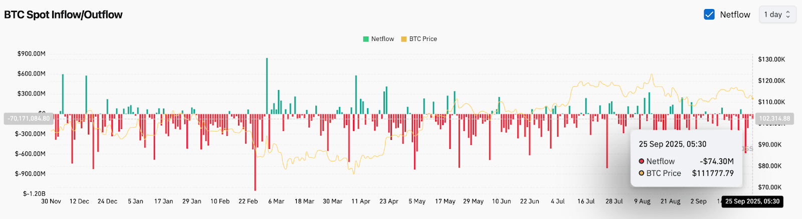 Данные о спотовых биржевых потоках продолжают указывать на осторожность в позиционировании. 25 сентября чистый отток биткоина составил 74,3 млн долларов, что отражает предпочтение инвесторов держать активы вне бирж. Хотя это свидетельствует о снижении давления на продажу, это также указывает на неустойчивость спотового спроса, поскольку накопление ещё не достигло устойчивого уровня.