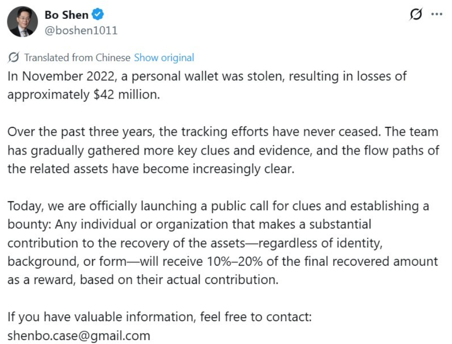 Соучредитель венчурной компании Fenbushi Capital Бо Шэнь предложил вознаграждение за возврат цифровых активов почти на $42 млн. Эти средства были украдены из его личного криптокошелька в результате взлома в 2022 году.