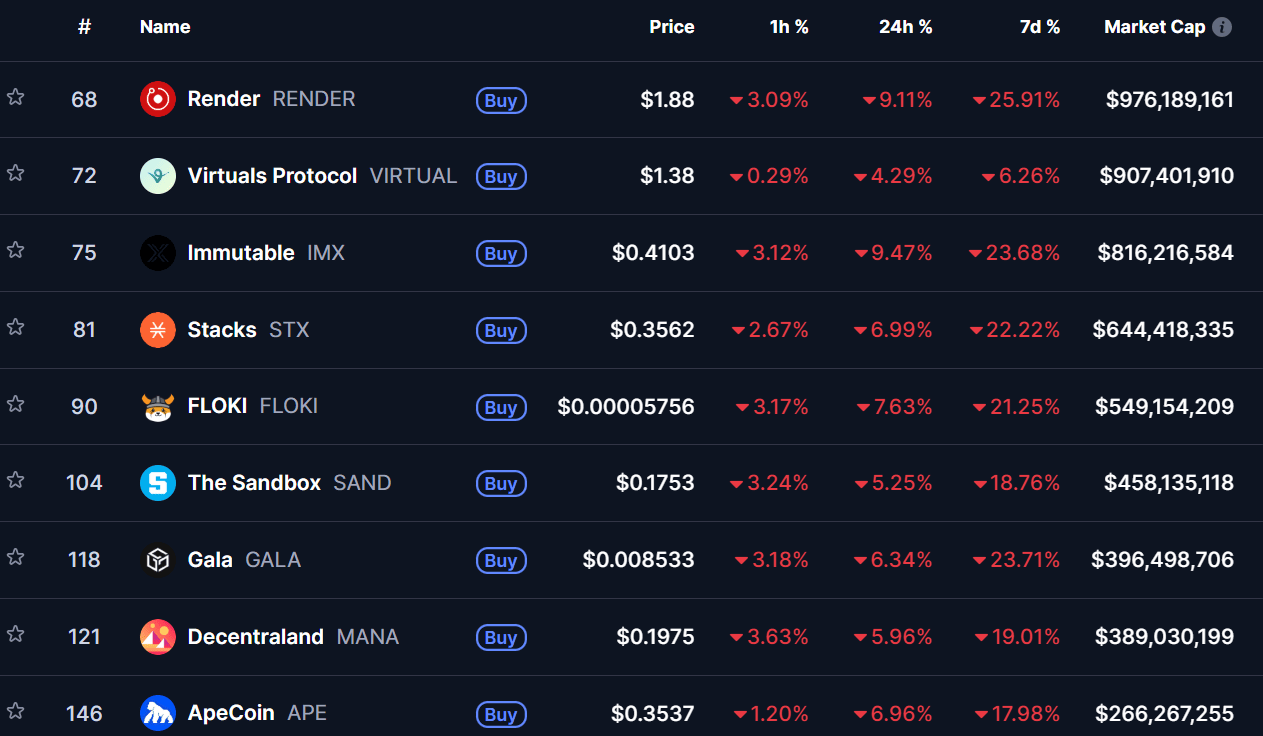 Already, gaming tokens have seen declines. In the last 24 hours, RENDER and IMX have lost more than 9%, and MANA and SAND have lost more than 5%. FLOKI is down 7.6%, and STX is down 6.9%.