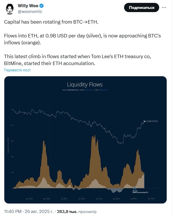 In addition, on Tuesday, analysts noted a significant flow of capital from Bitcoin (BTC) to эфириум, while futures activity, flows ETF and the whales’ positions are increasingly tilted towards the world’s second-largest cryptocurrency.