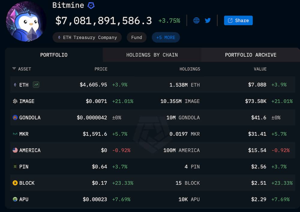 BitMine, a company linked to Fundstrat co-founder Tom Lee, now holds over $27 billion worth of ETH, according to on-chain analytics platform Arkham as of August 7,08. The organization’s 1,538 million ETH on its balance sheet makes it one of the largest corporate treasuries in the crypto space.