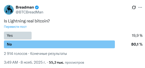Ко всему прочему тысячи участников опроса (80%) согласились с тем, что Lightning — это не настоящий BTC. Автор поста назвал BTC в сети Lightning «отдельным токеном в отдельной сети», несмотря на то, что у Lightning BTC нет рыночной капитализации, отличной от капитализации самого BTC.