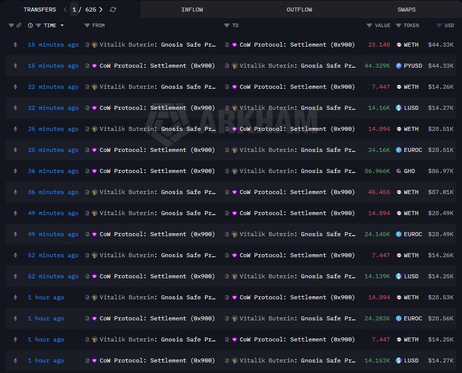 По данным Arkham, проанализированным Happy Coin News, за последние 48 часов Бутерин продал 1869 ETH на сумму около $3,67 млн.