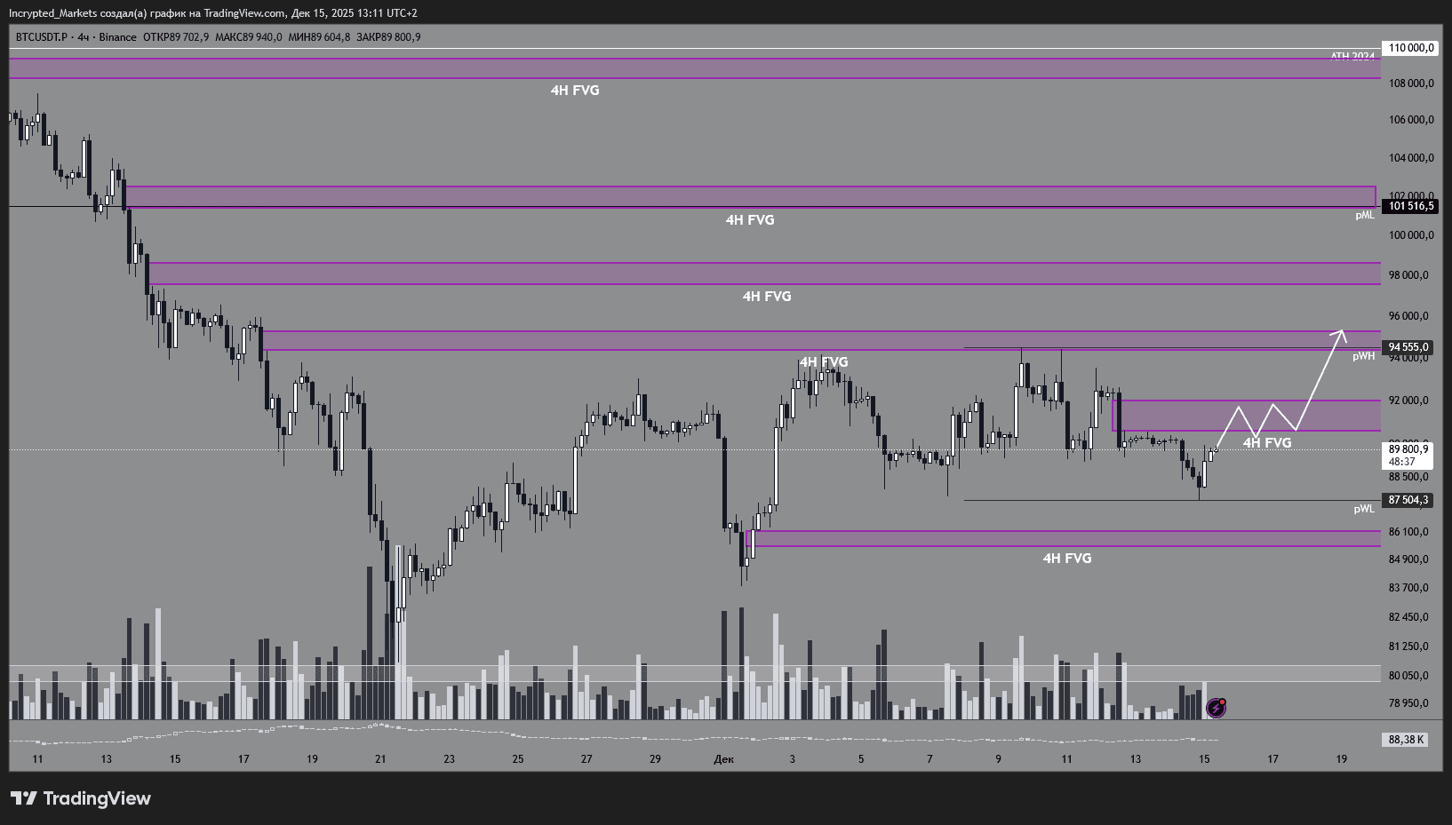 Классический сценарий предполагает изначальное вовлечение участников в лонг-позиции, после чего через фазу разгрузки и формирования шорт-позиций цена может сместиться к зоне интереса снизу. В этом раскладе область $85 000 выглядит одной из самых логичных целей для добора ликвидности.