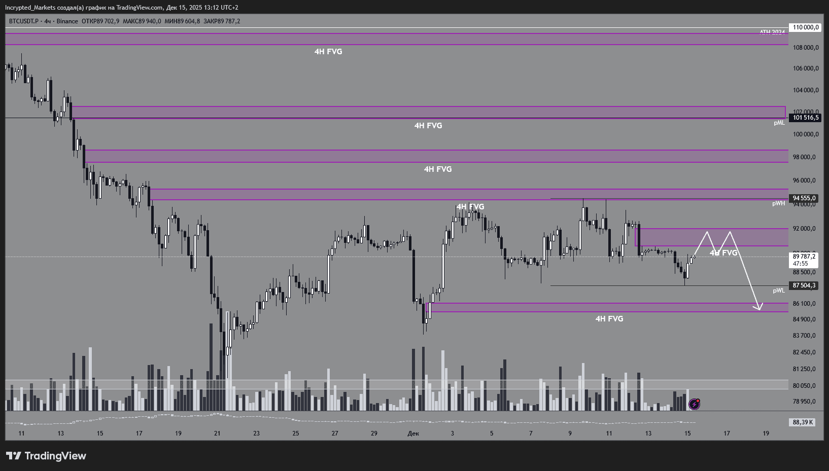 Рынок может оставаться в зоне (визуально $87 000-$93 000), делая выносы вверх, а затем провалы ниже минимумов прошлой недели со снятием стоп-лоссов. То есть сперва «забрали сверху», потом «добрали снизу», и лишь после этого дали структуру под импульс.