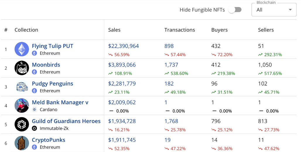 Moonbirds на Ethereum занял второе место с ростом на 108% до $3,89 млн. На коллекцию пришлось 1737 транзакций (рост на 538,60%). Число покупателей увеличилось на 219,38%. Pudgy Penguins заняли третье место с объёмом продаж около $2,28 млн, увеличив его на 23,11%.