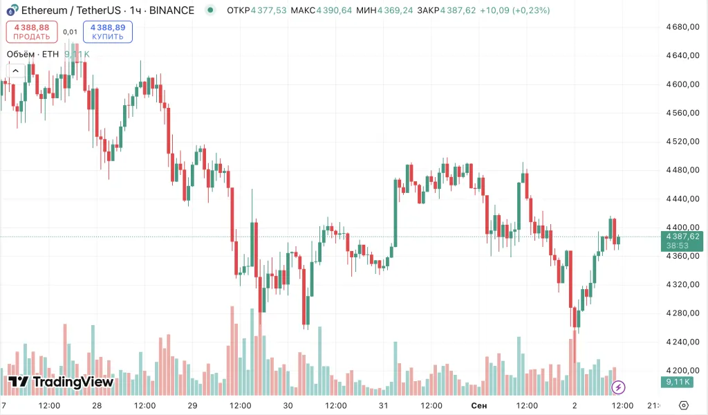 На момент написания Ethereum торгуется около $4400. За последние сутки его курс опустился на 2,2%.
